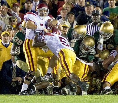 Notre Dame fans had spilled onto the field to celebrate a 31-28 victory over No. 1 USC when the officials restored :07 to the clock. The Trojans had the ball inside the Irish 1. Leinart took the snap and spun to his left. Tailback Reggie Bush had his back -- literally. The Bush Push propelled Leinart over the goal line (illegally?) for the Trojans' 28th straight victory, 34-31.